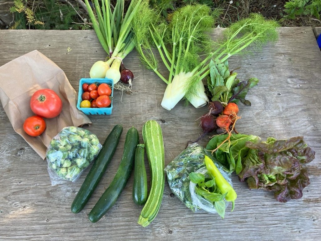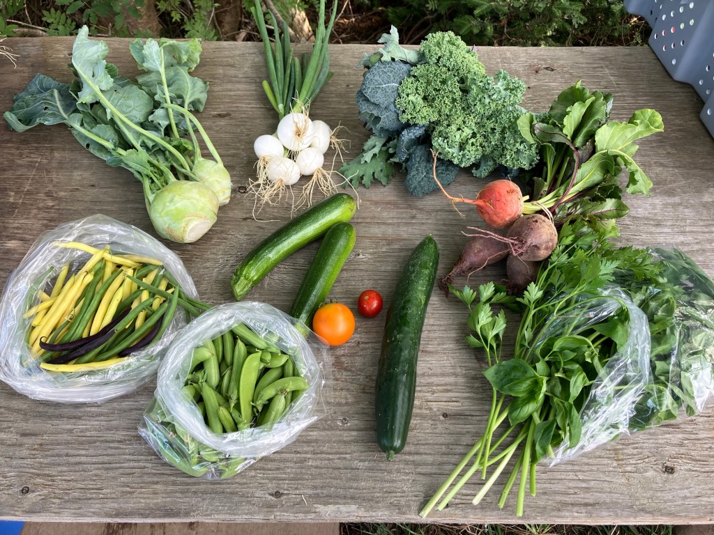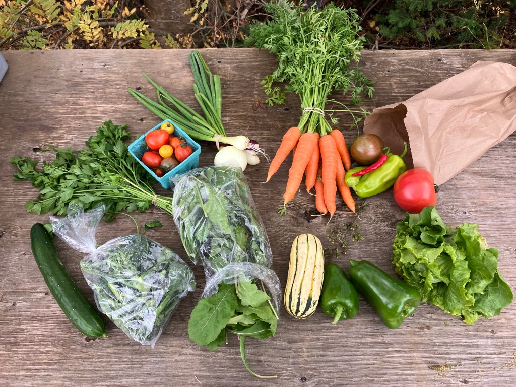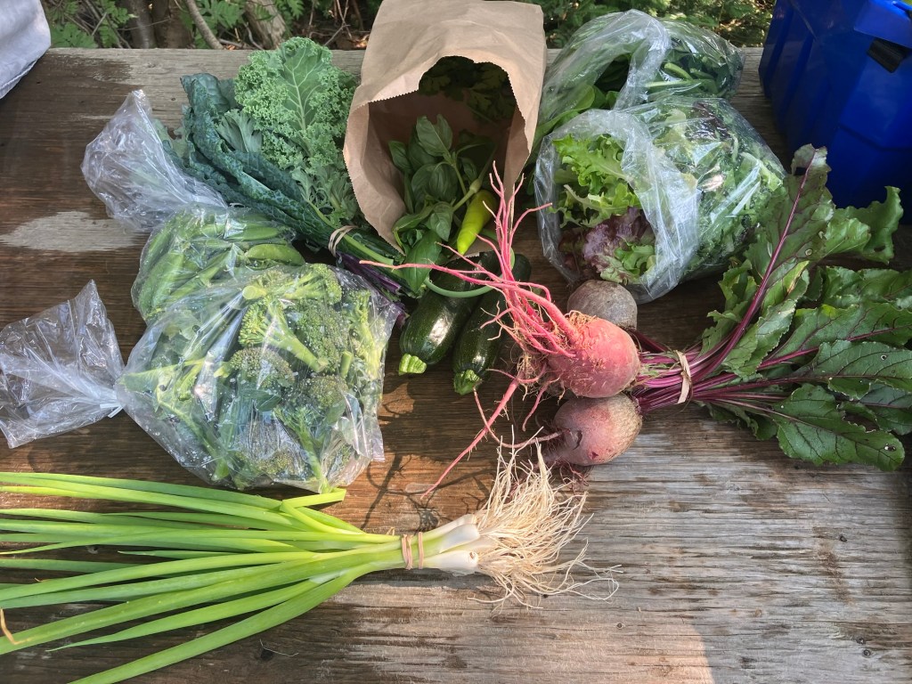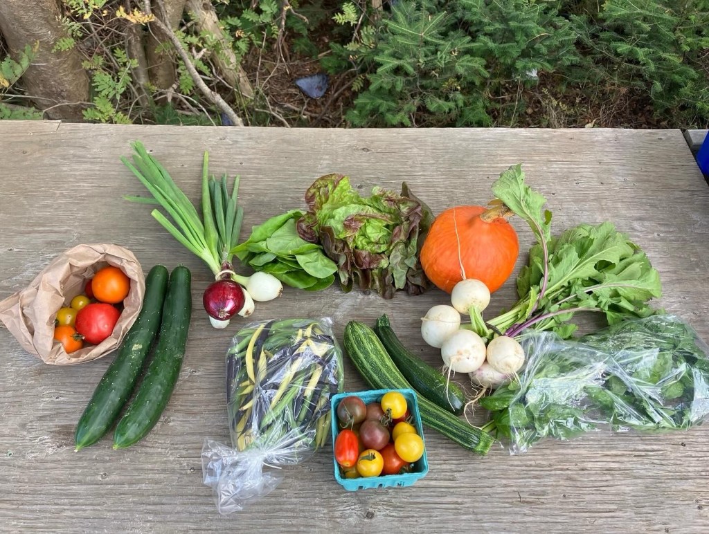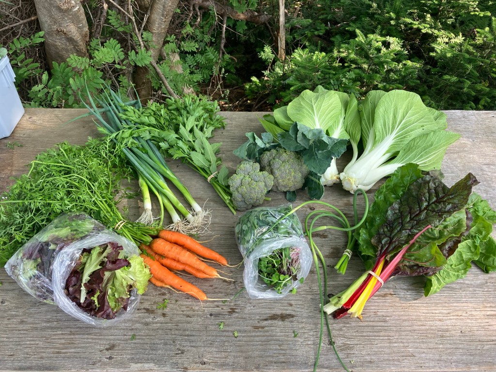 Leefy 1st of July share with leaf lettuce, radishes, arugula, giant spinach, beets, cilantro and mint, green onions, kale and mixed microgreens. Mid-July share with carrots, broccoli, Bok Choi, swiss chard, leaf lettuce, microgreens, green onions, garlic scapes, mint and parsley.End of July share with snap peas, broccoli, zucchinis, kale, lettuce mix, arugula, green onions, beets, basil, cilantro and garlic scapes.Mid August share with colorful beans, snap peas, beets, kale, kohlrabi, new white onions, cucumbers, zucchinis, basil and parsley and a little taste of the first tomatoes!Septembre 9th share with tomatoes, red cabbage, broccoli florets, shallots, basil, cilantro and hot pepper, zucchini, cucumber, lettuce and carrots!Mid September share with winter squash, cherry and regular size tomatoes, onions, hakurei turnips, lettuces, zucchinis, cucumber, bush beans and herbs (including basil).End of September share with Brussel sprouts, lettuce, tomatoes, zucchini, cucumbers, basil, cilantro, hot wax pepper, fennel, beets and onions.Early October share with carrots, lettuce, cherry tomatoes and big tomatoes, hot peppers, mixed onions with the greens, green peppers, arugula, brocoli florets, cucumber, delicata squash and parsley. Fall box end of October share with leeks, potatoes, tomatoes, cucumber, kohlrabi, cilantro, hot peppers, onions, salad turnips and little bell peppers. Fall box November share with carrots, Brussels sprouts, rutabaga, zucchini, Italian parsley, onions, Swiss chard, lettuce and a winter squash.